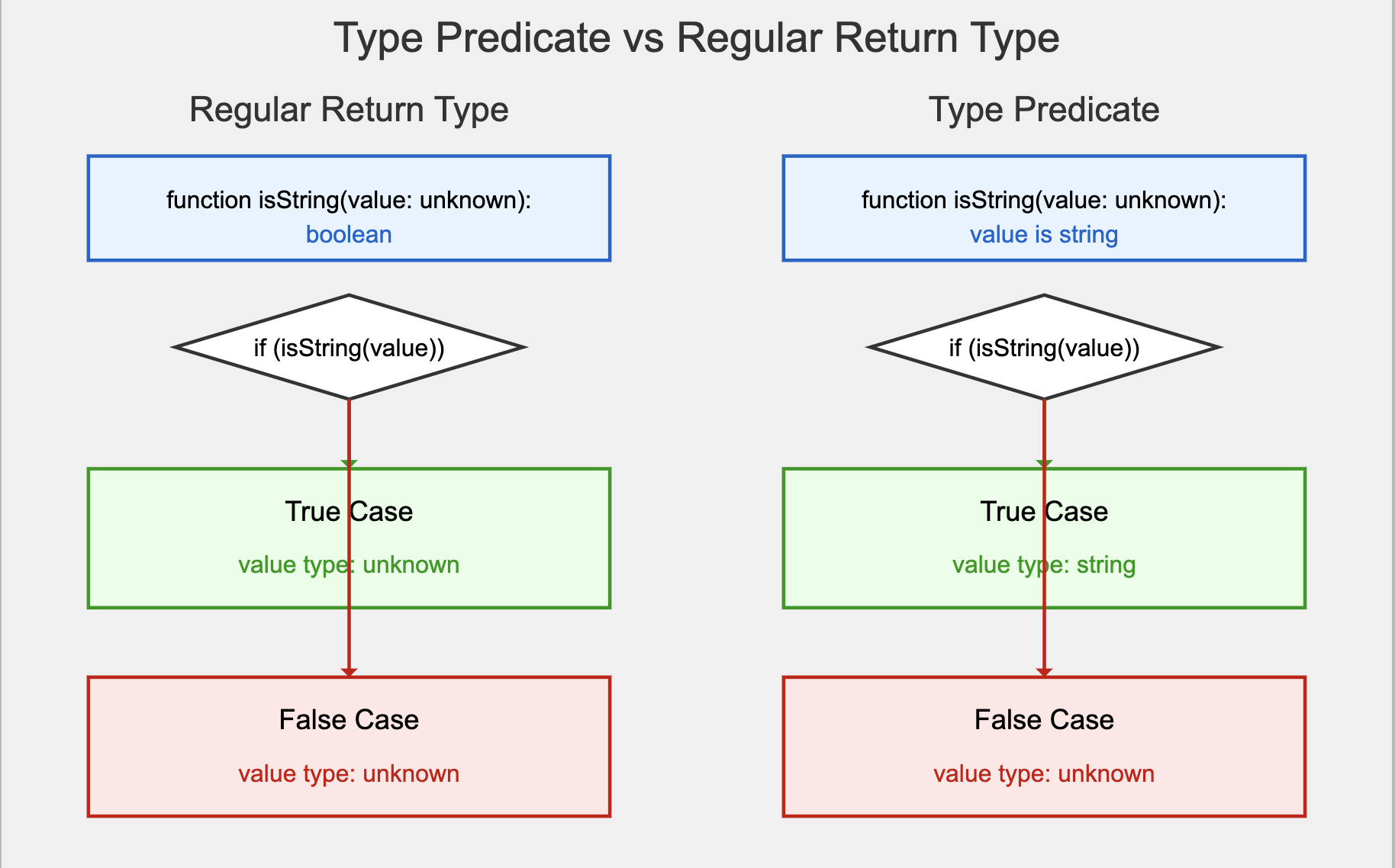 1. 타입 서술어란?타입 서술어는 TypeScript에서 특정 스코프 내의 변수 타입을 좁히는(narrowing) 데 사용되는 특별한 반환 타입입니다.함수가 true를 반환할 때, TypeScript는 인자의 타입을 특정 타입으로 취급합니다.2. 기본 구조function 함수이름(매개변수: 타입): 매개변수 is 특정타입 { return 불리언_표현식;}3. 간단한 예시: 문자열 체크function isString(value: unknown): value is string { return typeof value === 'string';}// 사용 예:function processValue(value: unknown) { if (isString(value)) { // 여기서 ..